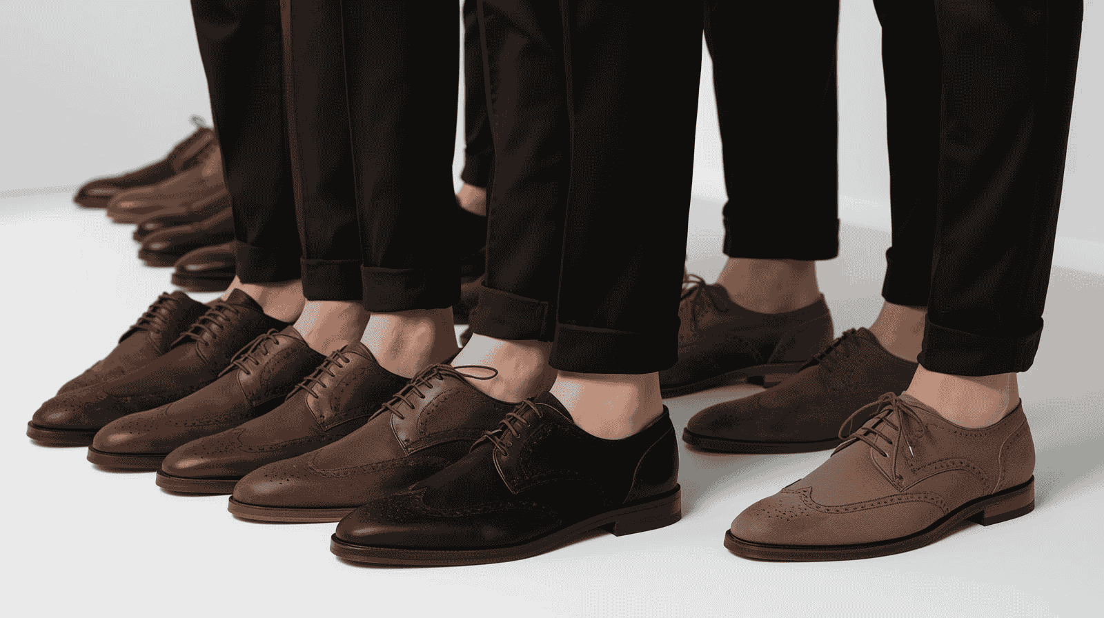 - Best styles: Tan brogues, cognac loafers, chocolate suede boots