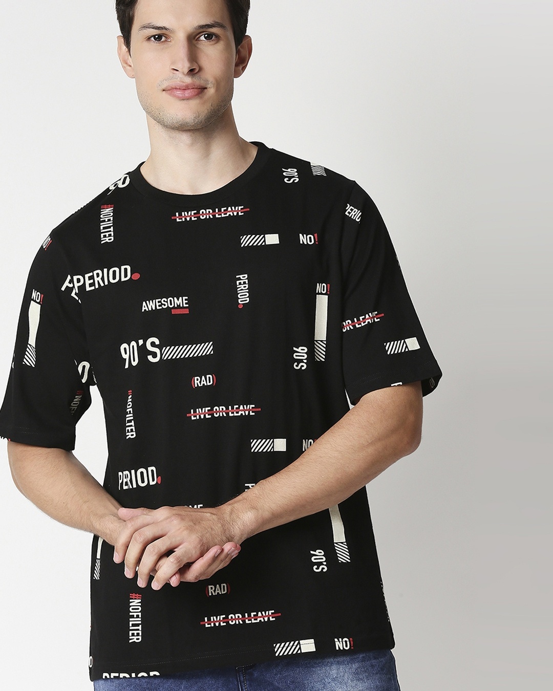Men's Black Blocks And Fonts All Over Printed Relaxed Fit T-shirt