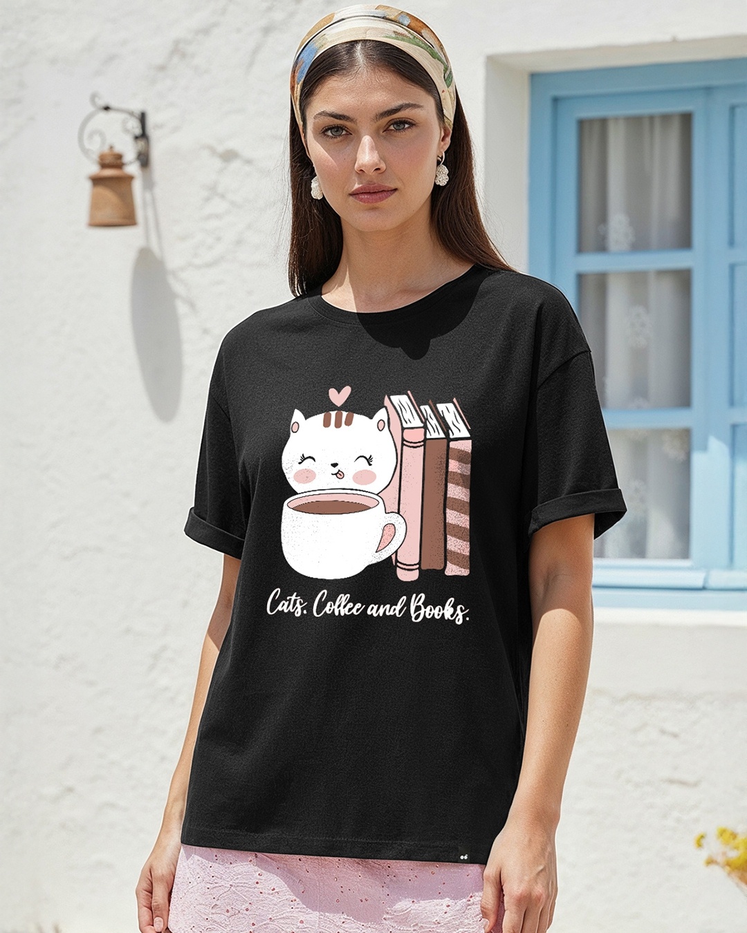 Women's Black Cats Coffee & Books Graphic Printed Boyfriend T-shirt
