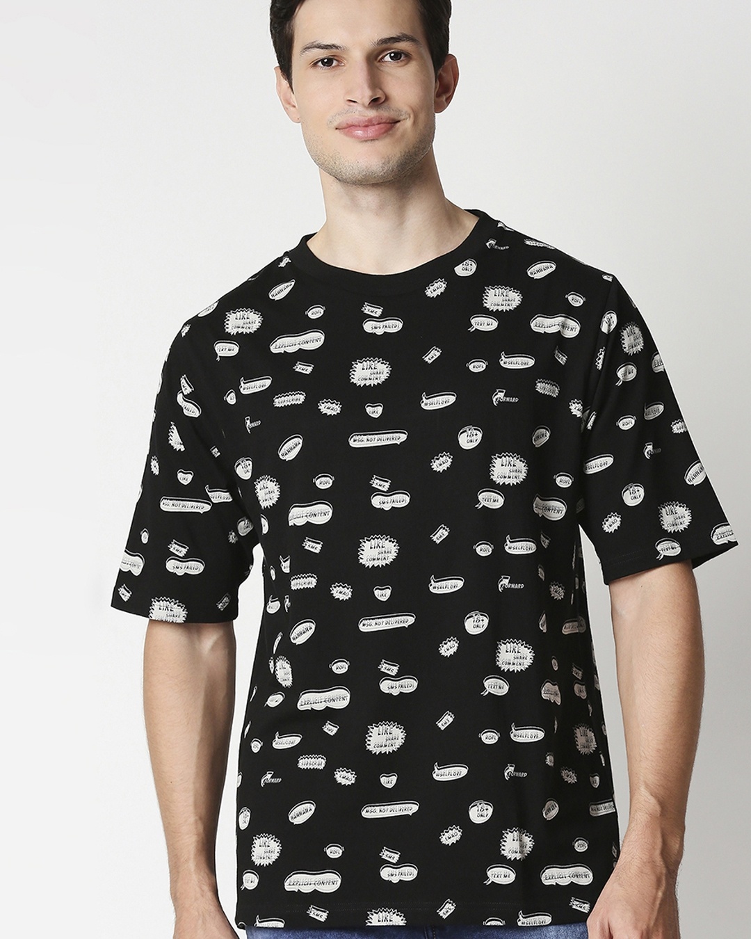 Men's Black Comic Text All Over Printed Relaxed Fit T-shirt