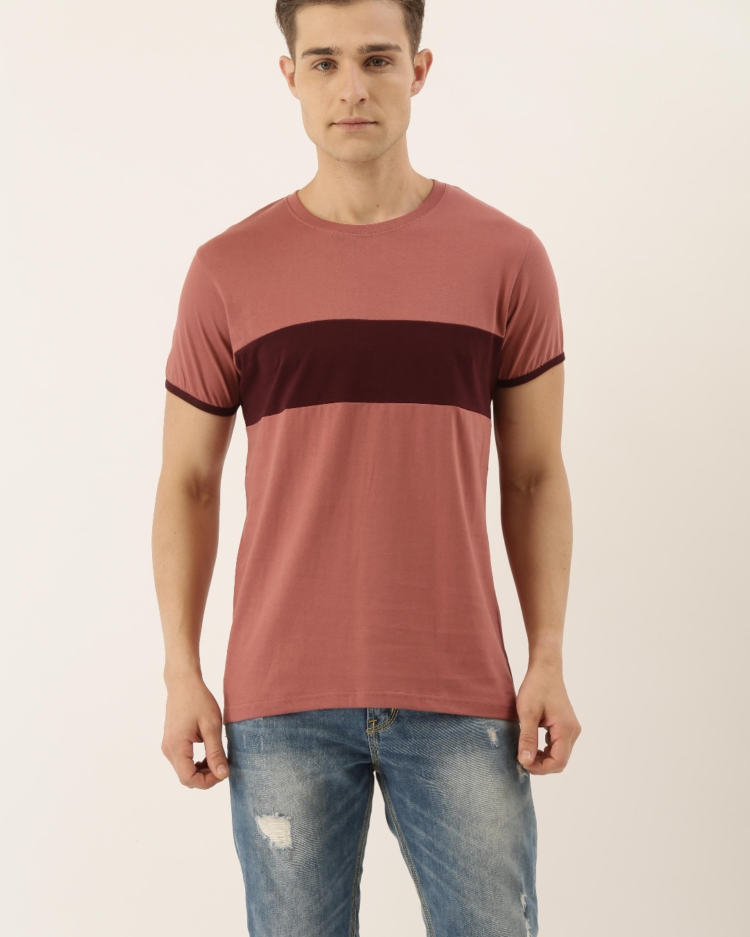 Men's Pink Color Block Slim Fit T-shirt