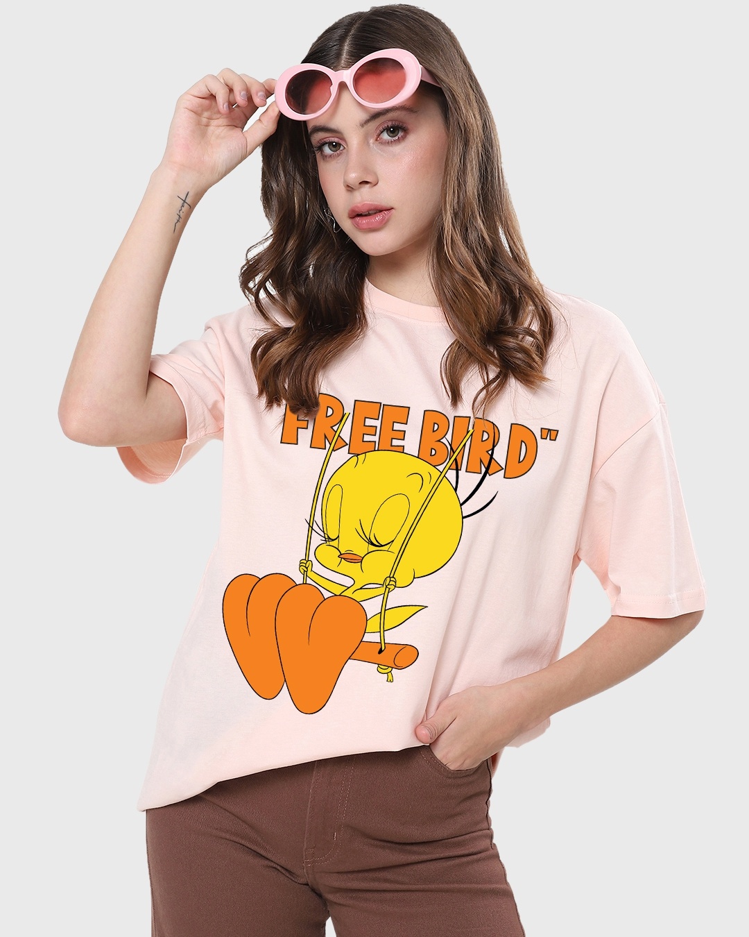 Women's Pink Free Bird Graphic Printed Oversized T-shirt