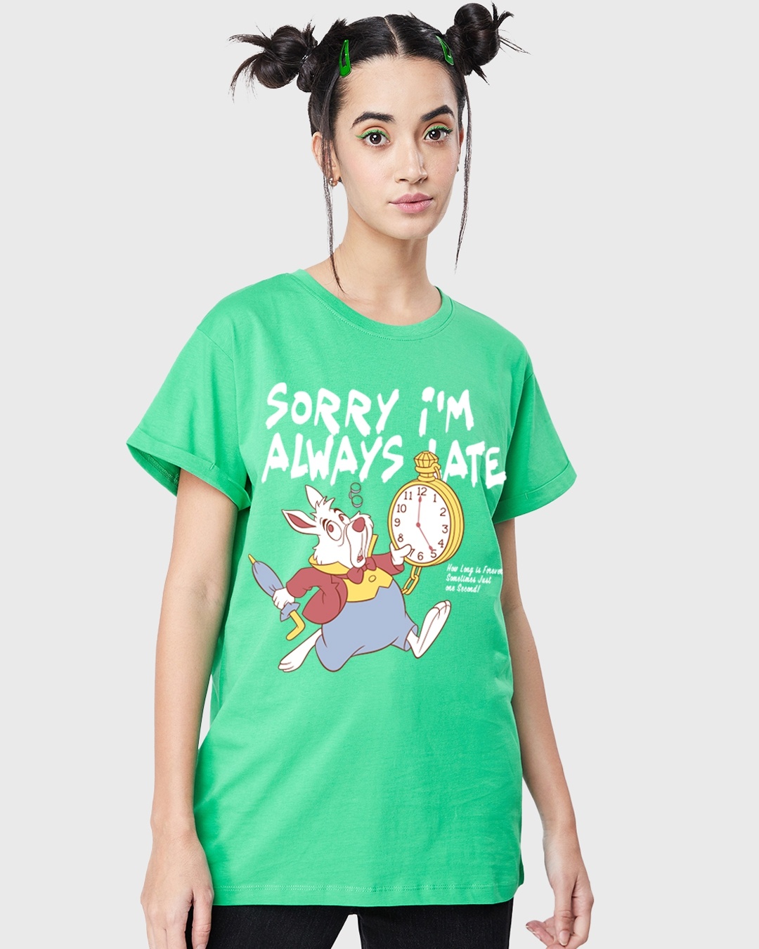 Women's Green Sorry I'm Always Late Graphic Printed Boyfriend T-shirt