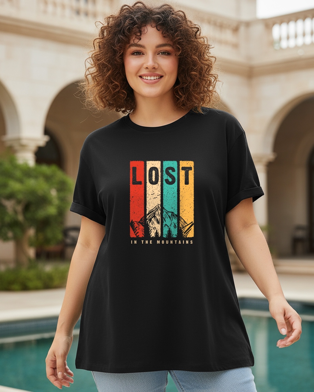 Women's Black Lost Mountains Graphic Printed Plus Size Boyfriend T-shirt