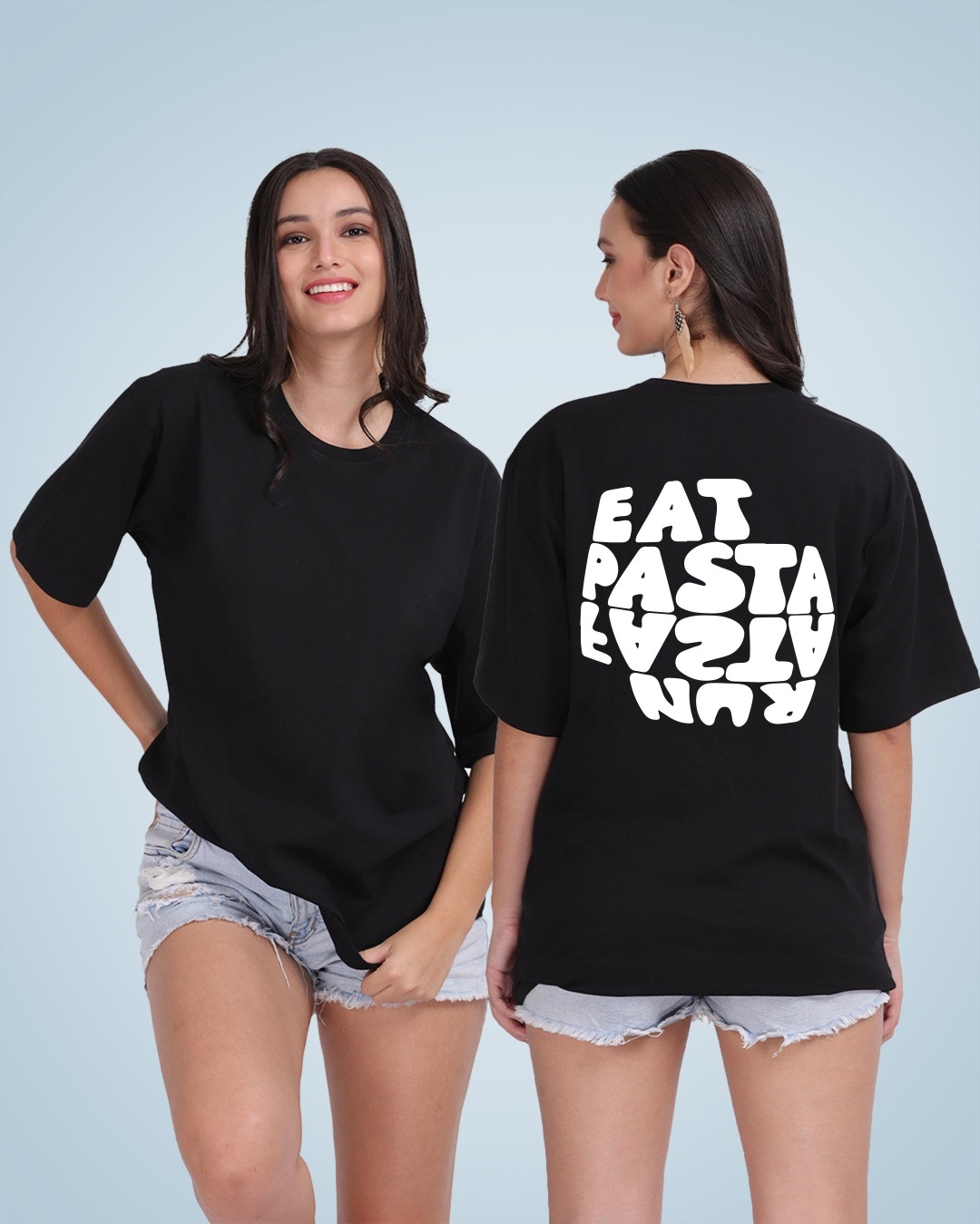 Women's Black Eat Pasta Run Fasta Typographic Oversized T-shirt