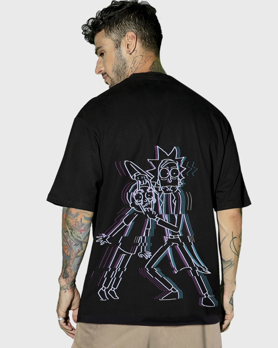 Men's Black Glitch R&M Graphic Printed Oversized T-shirt