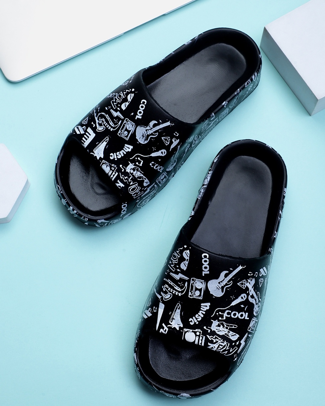 Men's Black All Music Printed Sliders