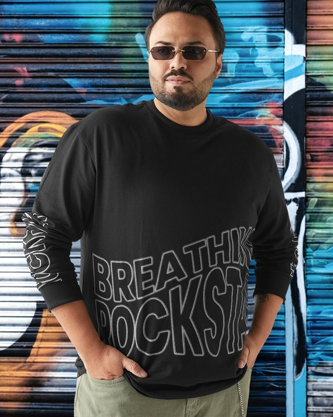 Men's Black Breathing Rockstar Typography Oversized Plus Size T-shirt