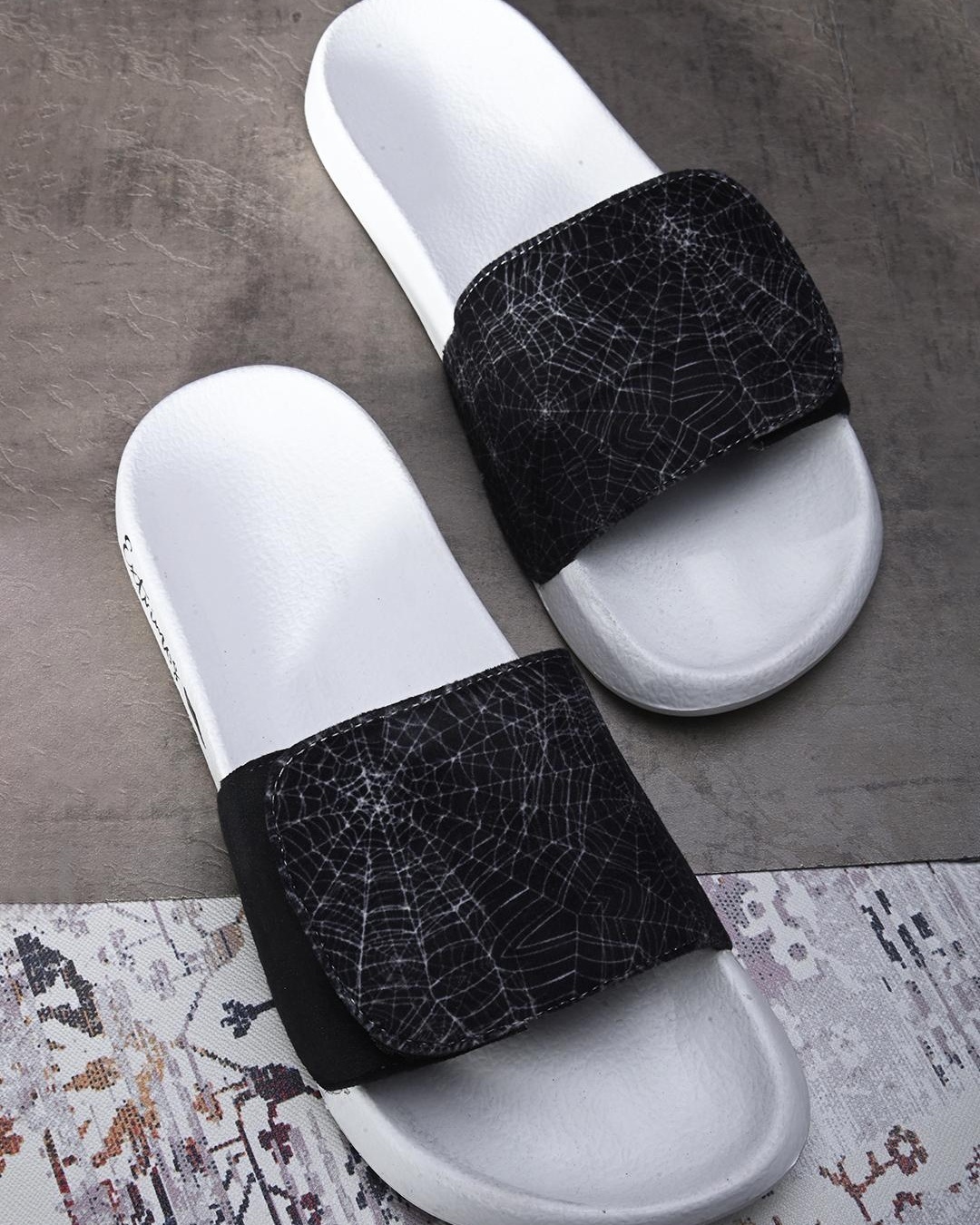Men's Black Cobweb Printed Adjustable Strap Sliders