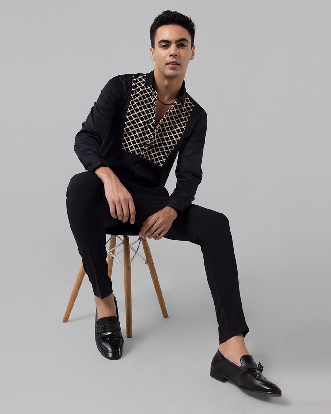 Men's Black Cross Chain Embroidered Slim Fit Shirt