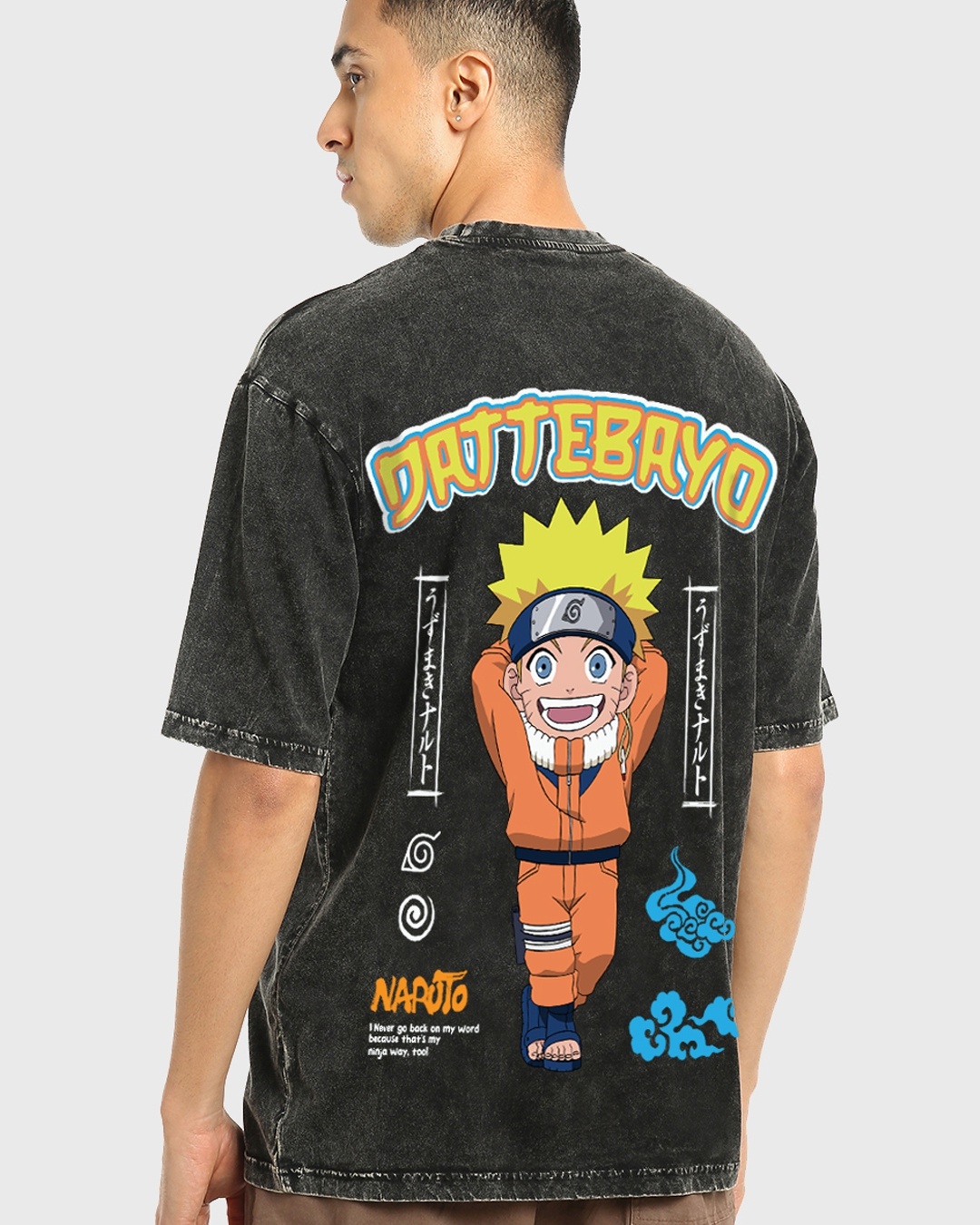 Men's Black Dattebayo Graphic Printed Oversized Acid Wash T-shirt