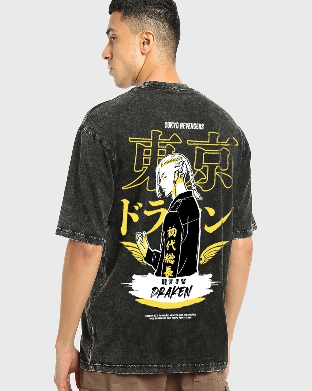 Men's Black Draken Tokyo Graphic Printed Oversized Acid Wash T-shirt