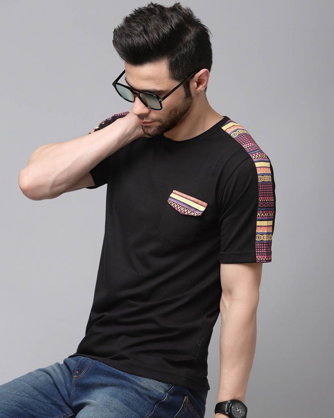 Men's Black Ethnic Motif Printed Slim Fit T-shirt