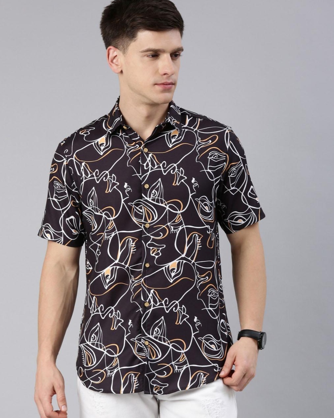Men's Black Figure Abstract Printed Slim Fit Shirt