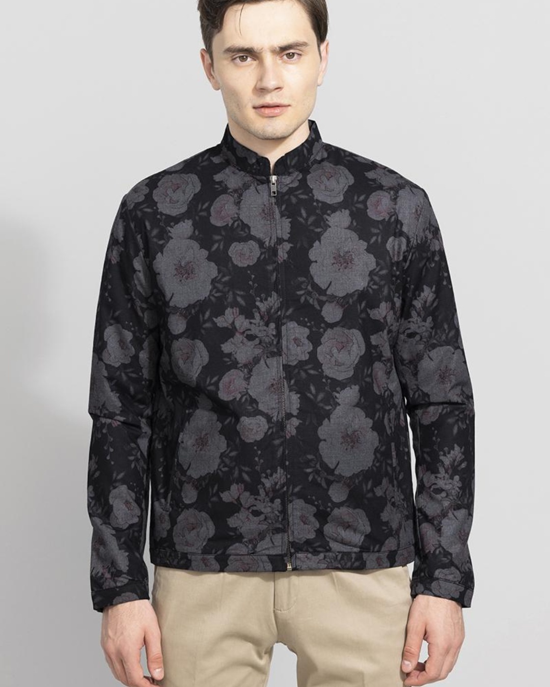Men's Black Floral Printed Slim Fit Jacket