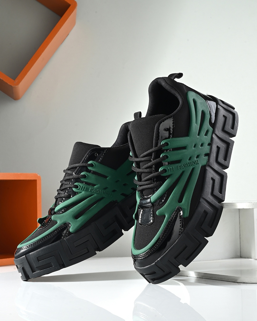 Men's Black & Green Color Block Chunky Sneakers
