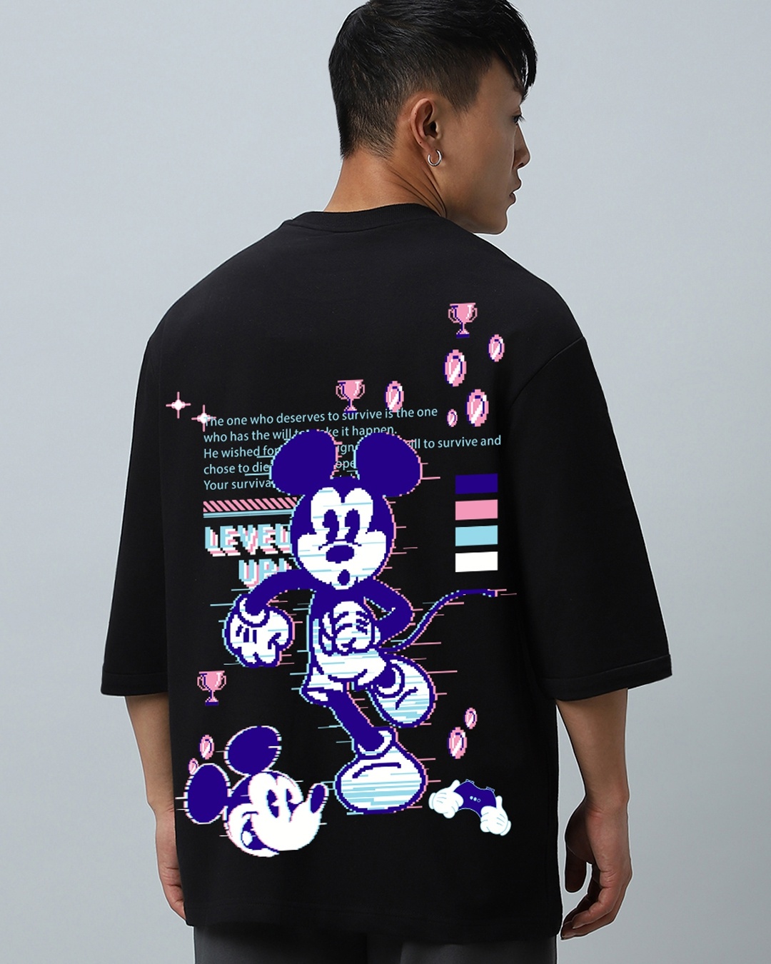 Men's Black Level Up Mickey Graphic Printed Super Loose Fit T-shirt
