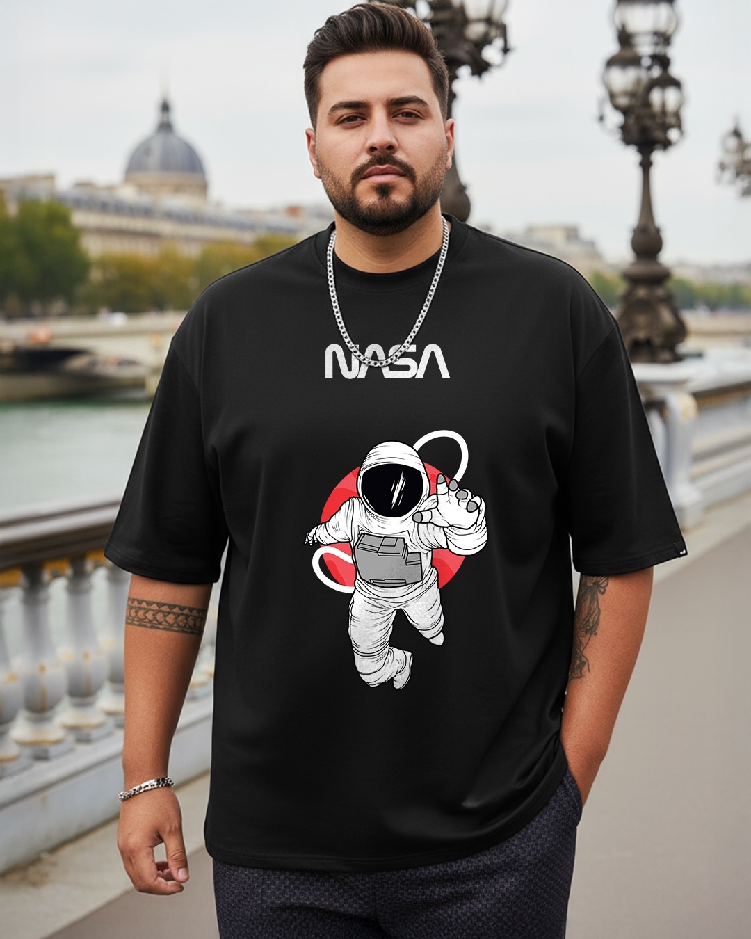 Men's Black NASA Astronaut Graphic Printed Oversized Plus Size T-shirt