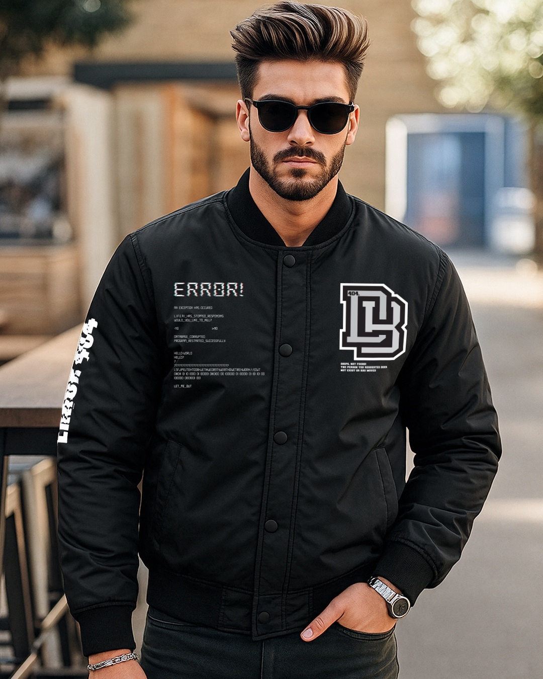Men's Black Error Typography Oversized Bomber Jacket