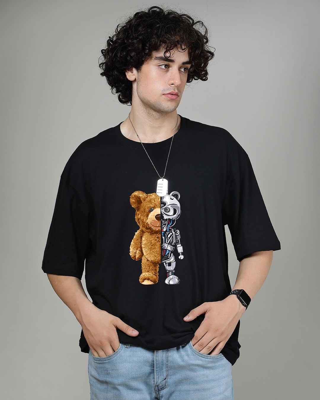 Men's Black Robo Teddy Graphic Printed Oversized T-shirt