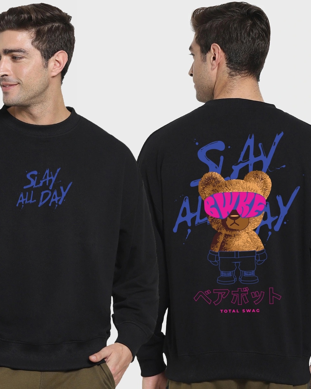 Men's Black Slay All Day Graphic Printed Oversized Sweatshirt
