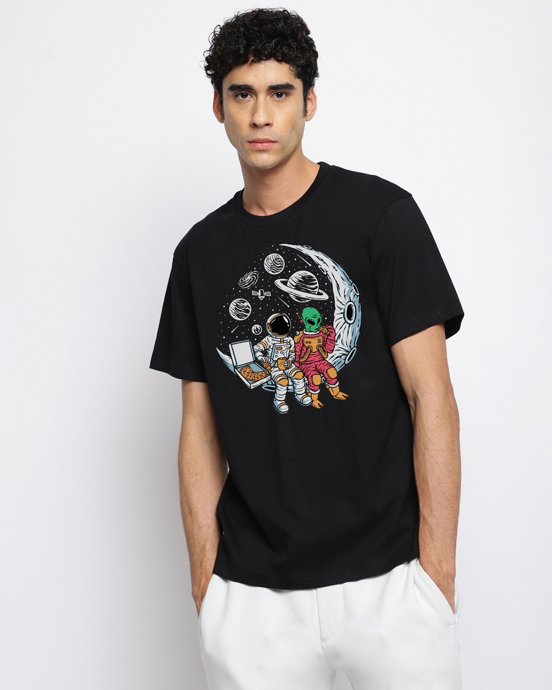 Men's Black Space Astronaut Graphic Printed Oversized T-shirt
