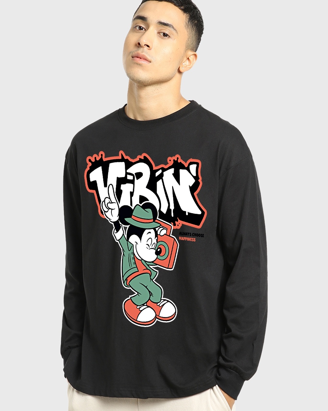 Men's Black Vibin Mickey Graphic Printed Oversized T-shirt