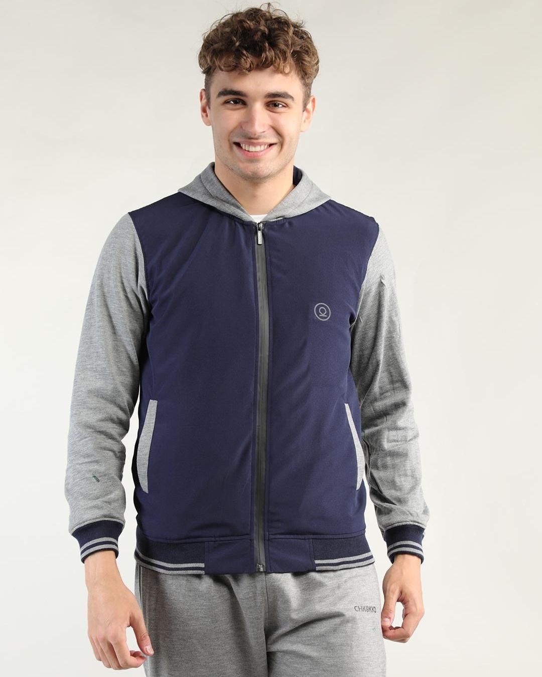 Men's Blue & Grey Color Block Hooded Jacket