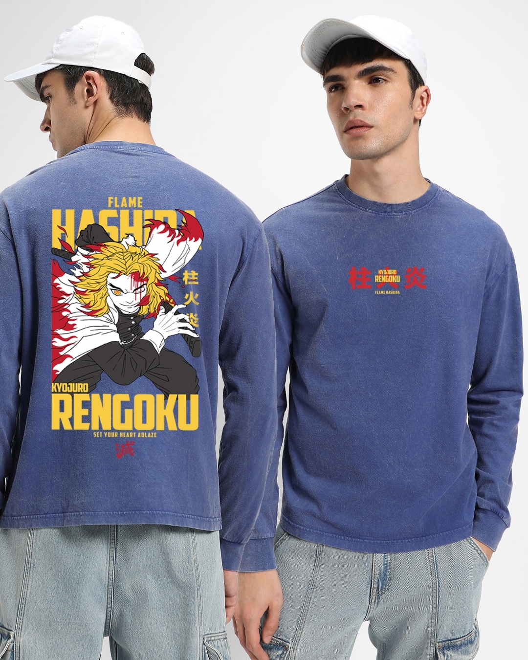 Men's Blue Flame Hashira Graphic Printed Oversized Acid Wash T-shirt