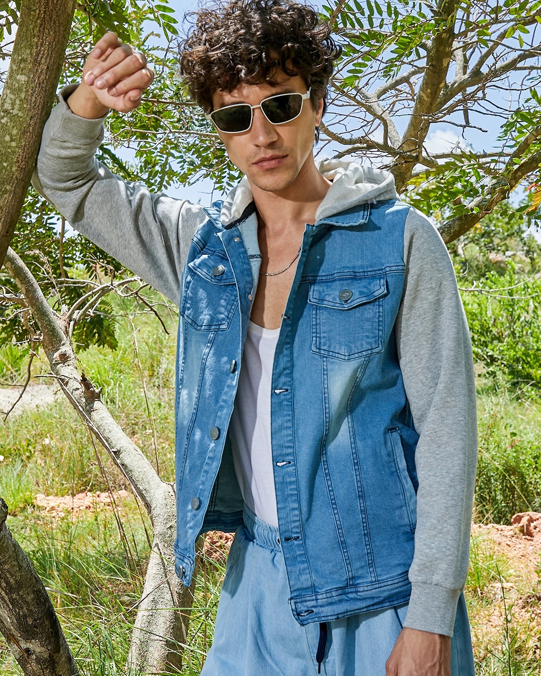 Men's Blue & Light Grey Washed Hooded Denim Jacket