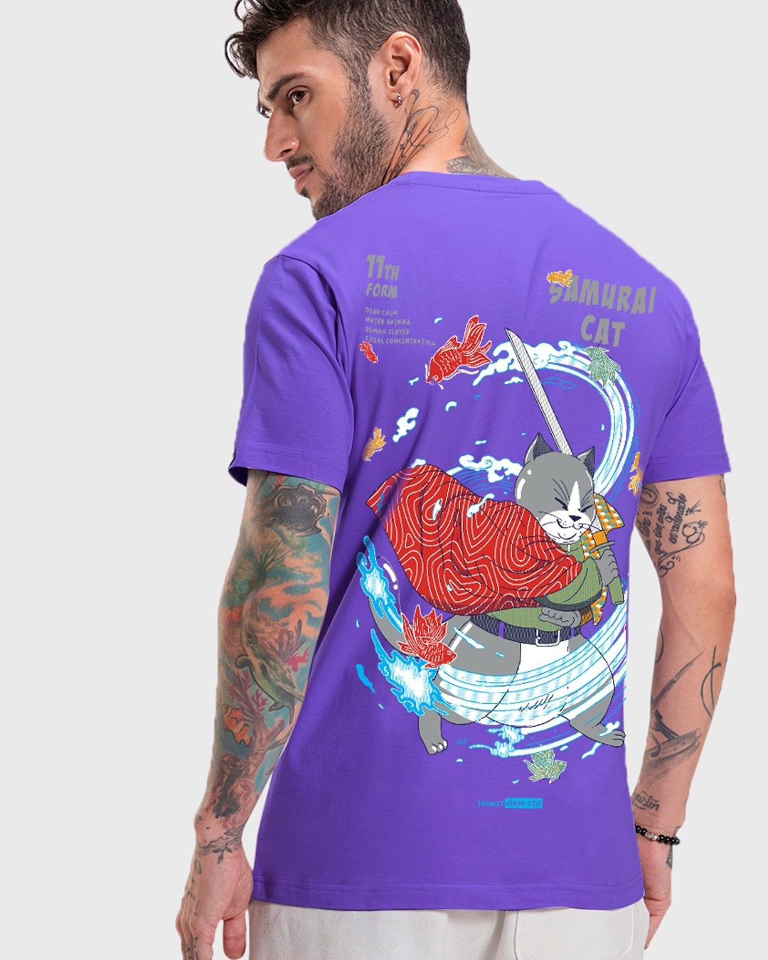 Men's Blue Samurai Cat Graphic Printed T-shirt