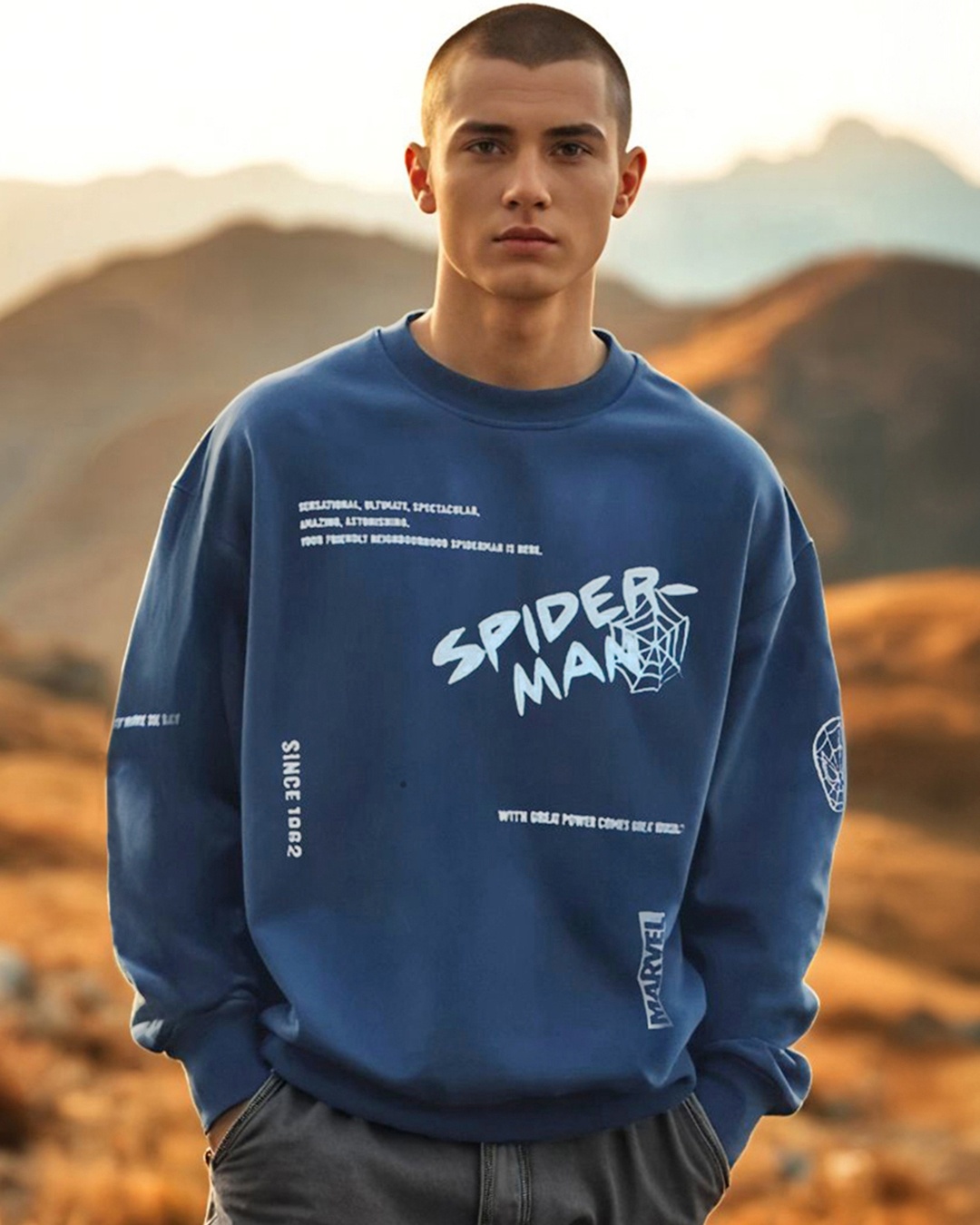 Men's Blue Spiderman Graphic Printed Oversized Sweatshirt