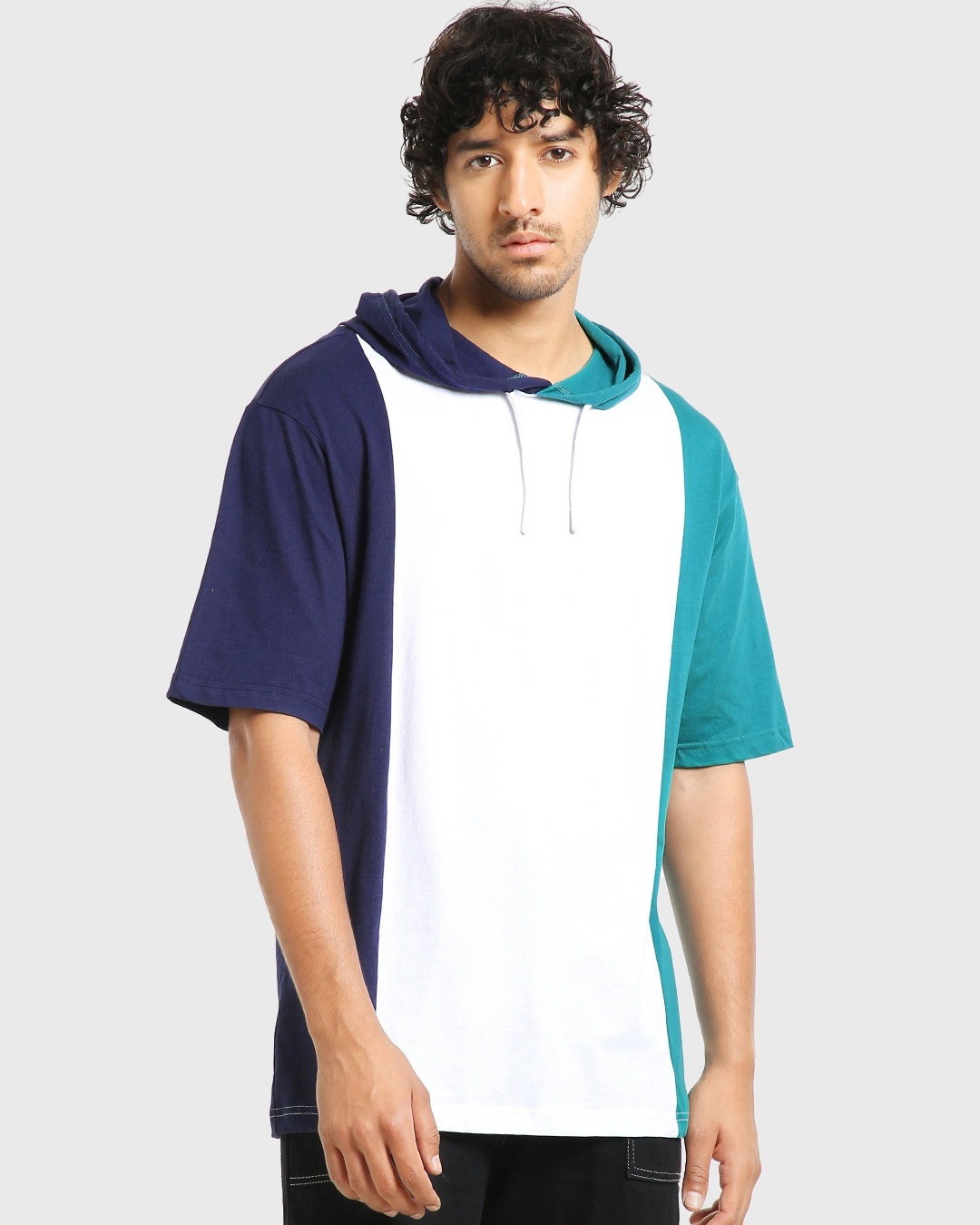 Men's White & Blue Color Block Oversized Hoodie T-shirt