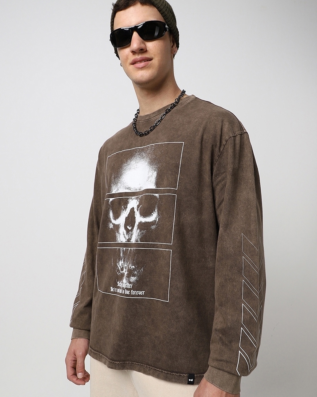 Men's Brown Life Decay Graphic Printed Oversized T-shirt