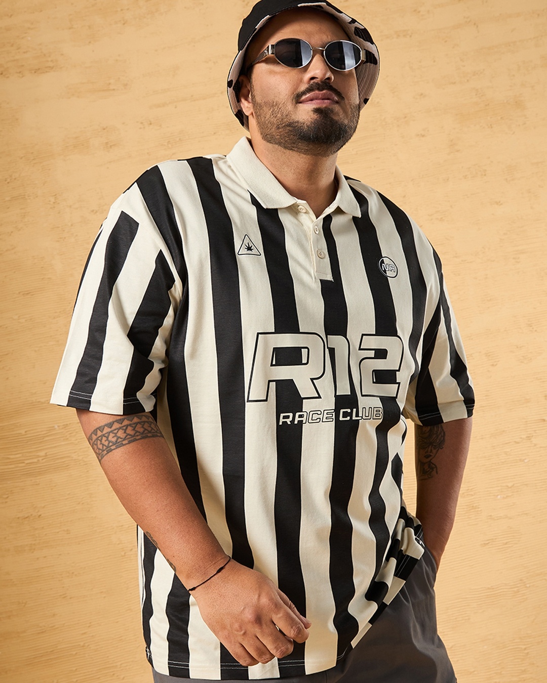 Men's Brown & Black R12 Race Club Striped Plus Size Polo T-shirt