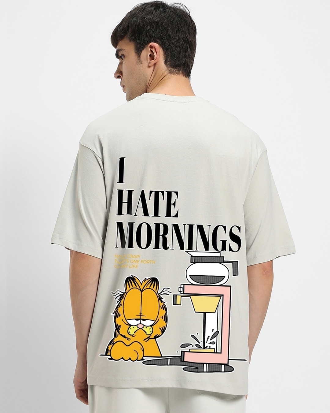 Men's Grey Garfield Hates Mornings Graphic Printed Oversized T-shirt