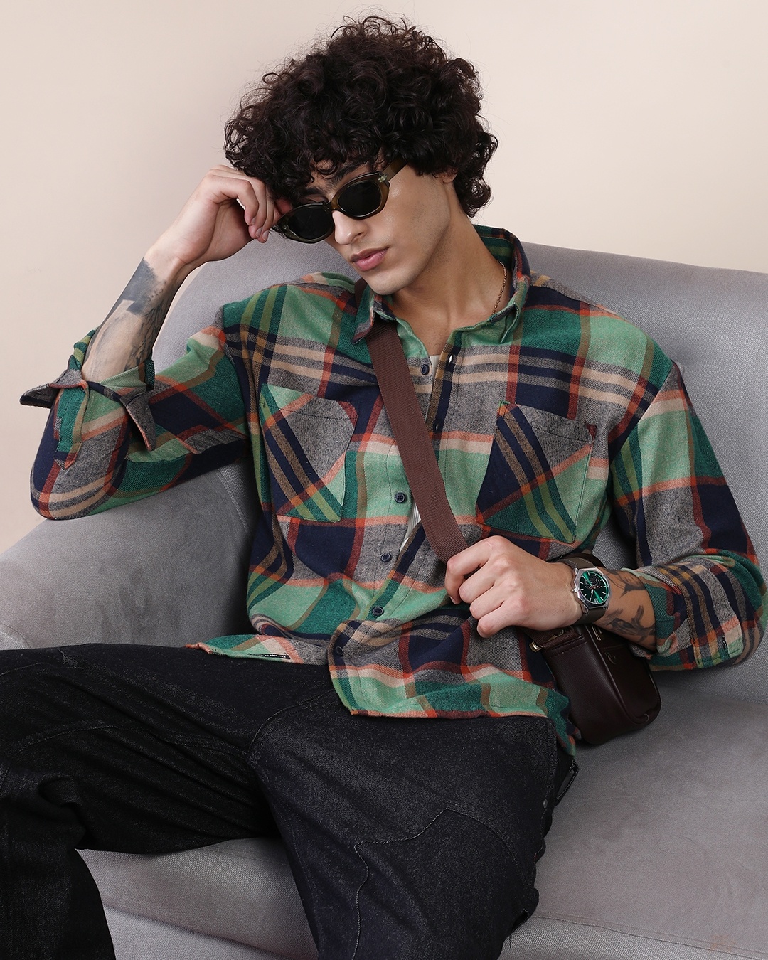 Men's Jungle Green & Navy Blue Checked Oversized Shacket