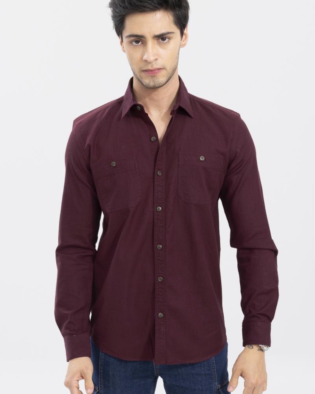 Men's Maroon Double Pocket Slim Fit Shirt