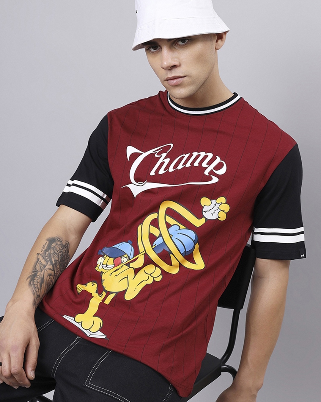 Men's Maroon Garfield Champ Graphic Printed Oversized T-shirt