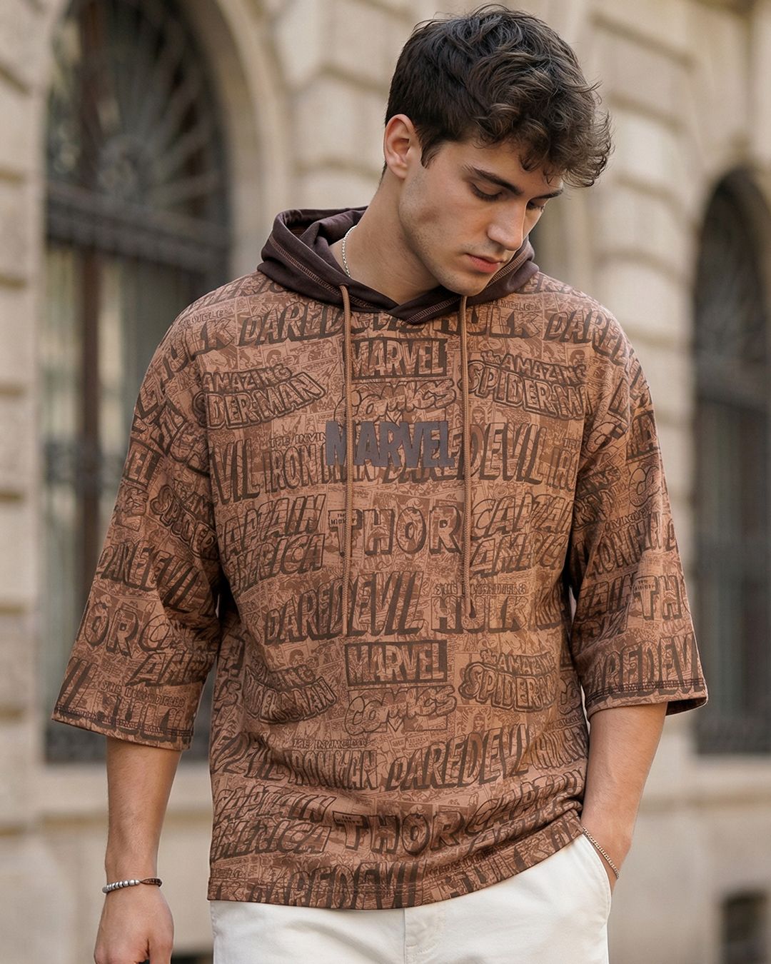 Men's Mocha Mousse Brown Marvel All Over Printed Oversized Hoodie T-shirt