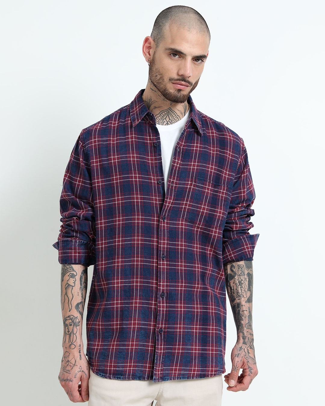 Men's Navy Blue & Maroon Checked Denim Shirt