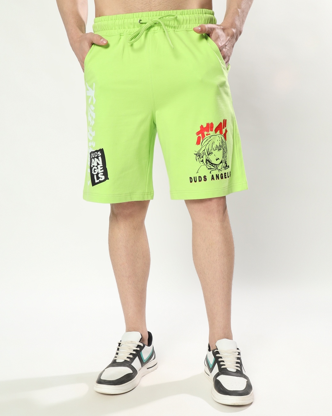 Men's Neon Green Duds Anime Girl Graphic Printed Relaxed Fit Shorts