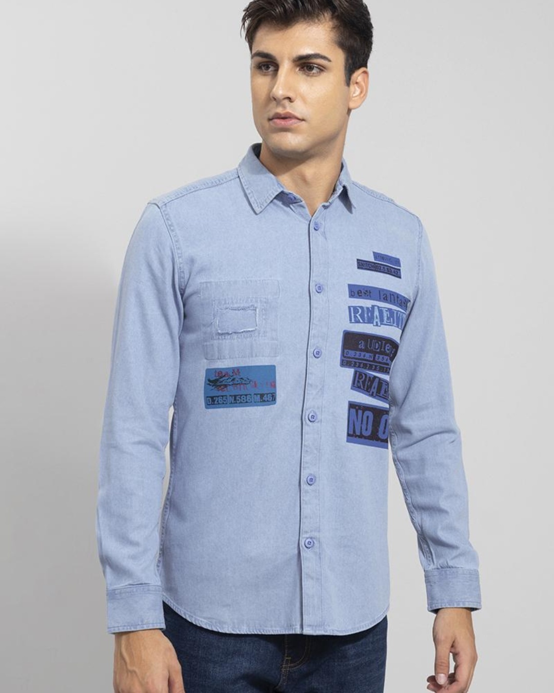 Men's Sky Blue Typography Denim Slim Fit Shirt