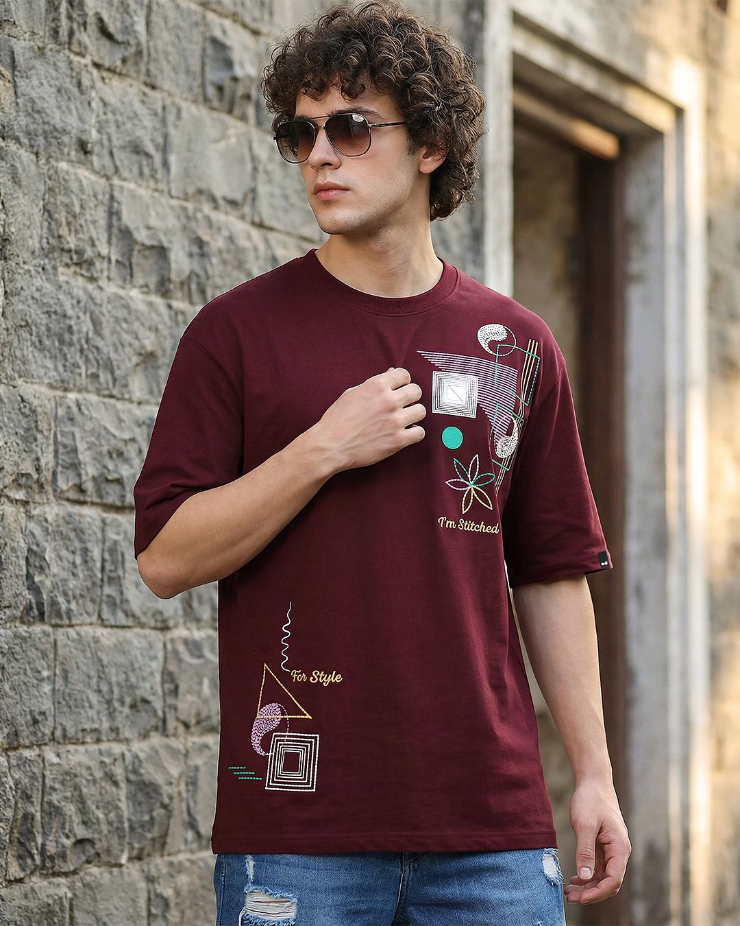 Men's Tawny Port Maroon Embroidered Oversized T-shirt
