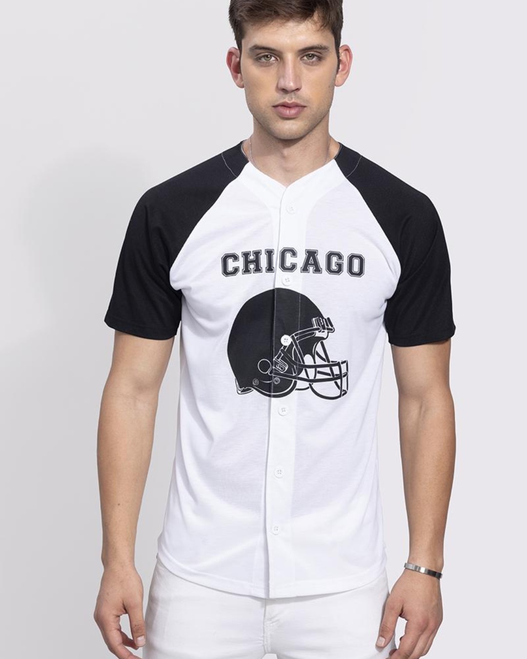 Men's White & Black Chicago Color Block Slim Fit Baseball Shirt