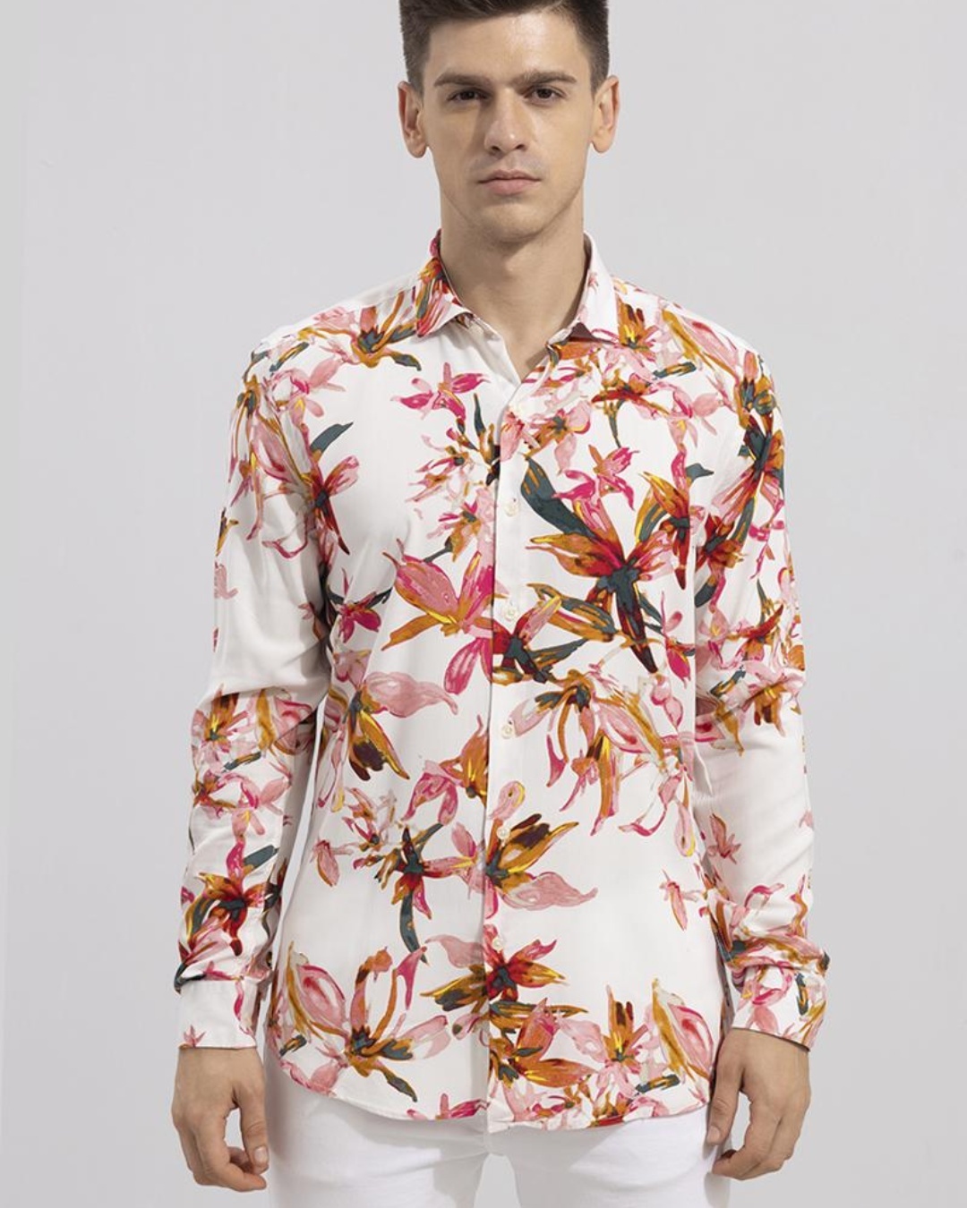 Men's White Floral Printed Slim Fit Shirt