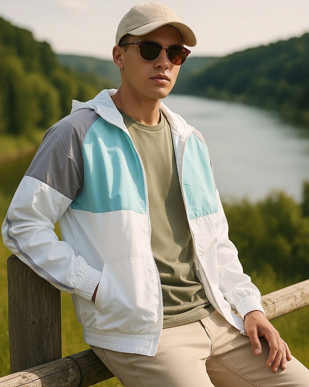 Men's White & Blue Color Block Hooded Windcheater Jacket