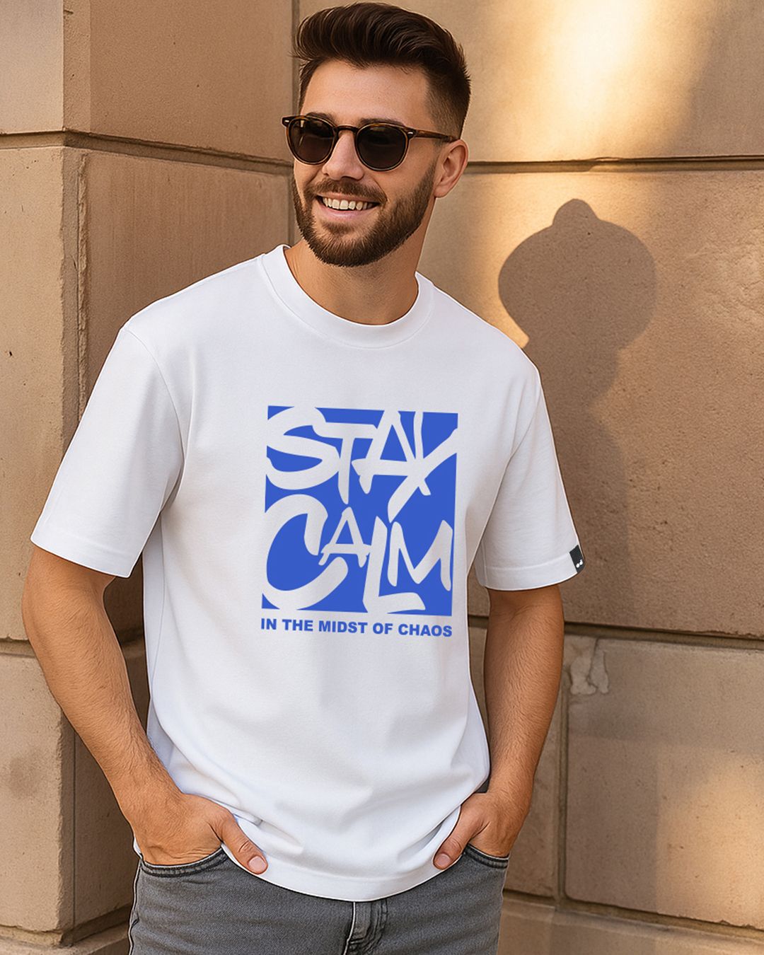 Men's White Stay Calm Typography Oversized T-shirt