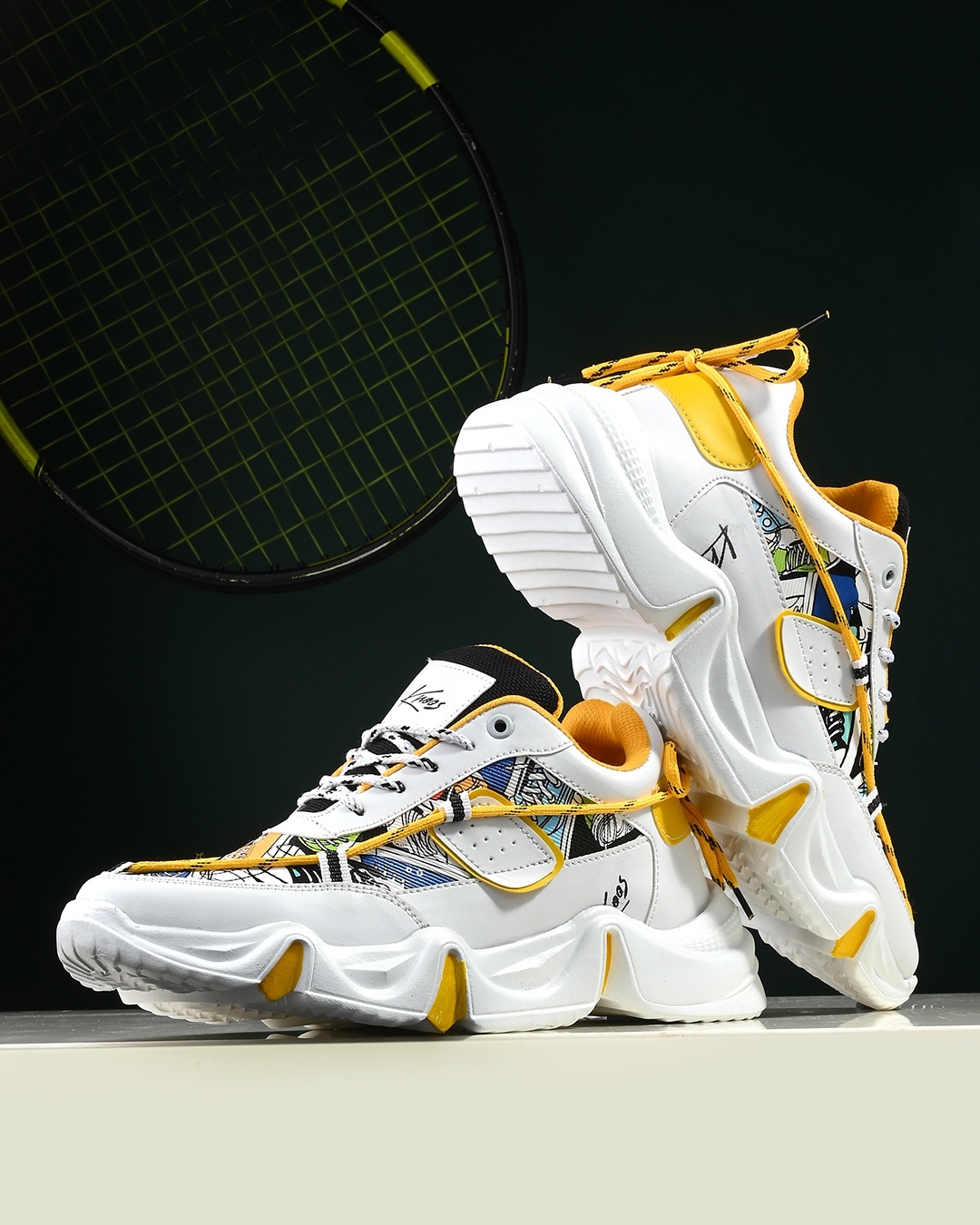 Men's White & Yellow Printed Sneakers