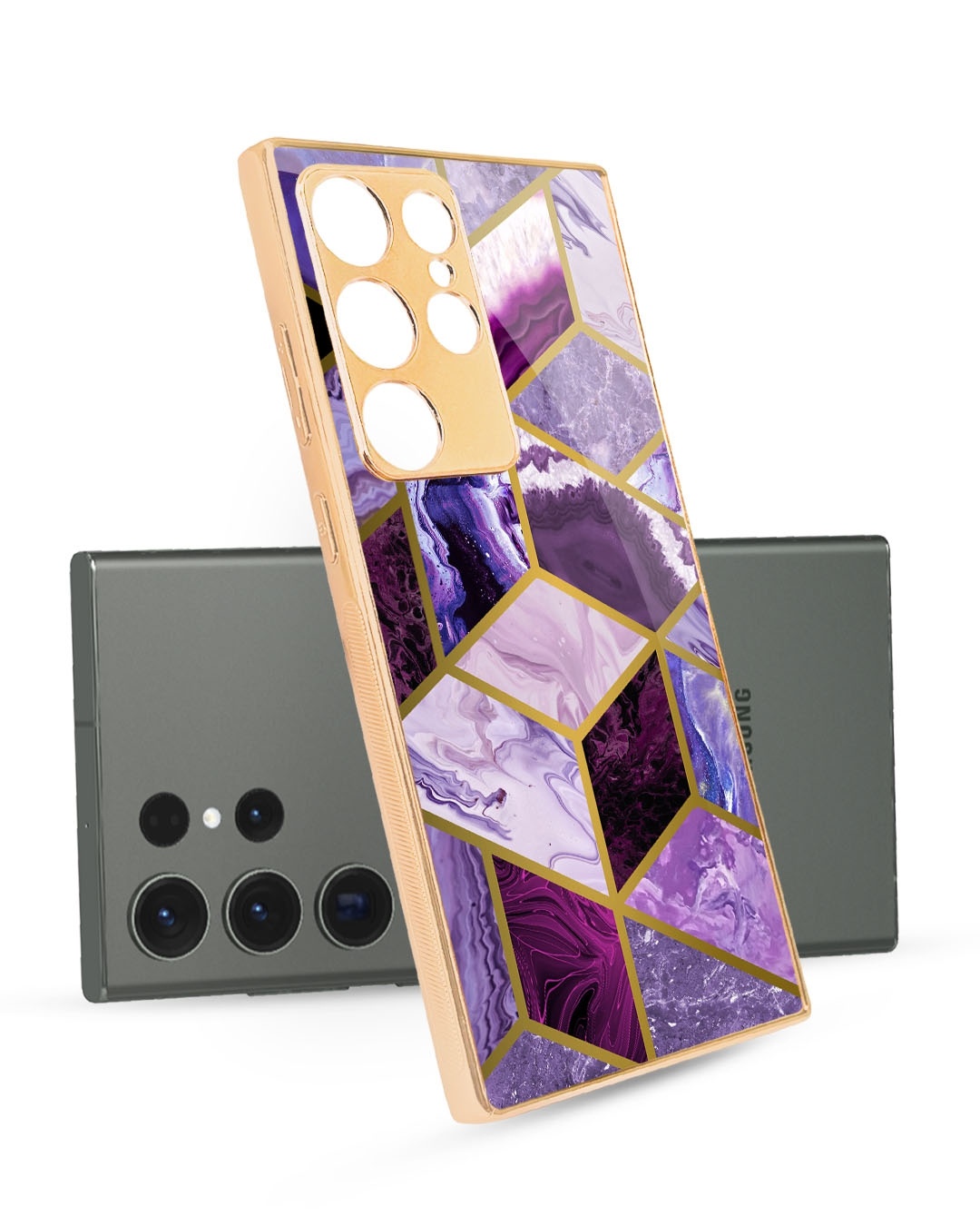 Purple Rhombus Marble Copper Metallic Gold Premium Glass Case for Samsung Galaxy S23 Ultra 5G